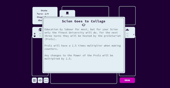 If a faction becomes discontent and have enough power, special "intervention" cards will be put into the deck. These cards could bring an early end to your career or foil your sweet retirement plans for good. If either you or your Scion dies, the game ends in a loss. If you manage to make it to the end of turn 9 with your head still attached and your Scion still skipping, you can enjoy your victory on a tropical paradise world of your choice.